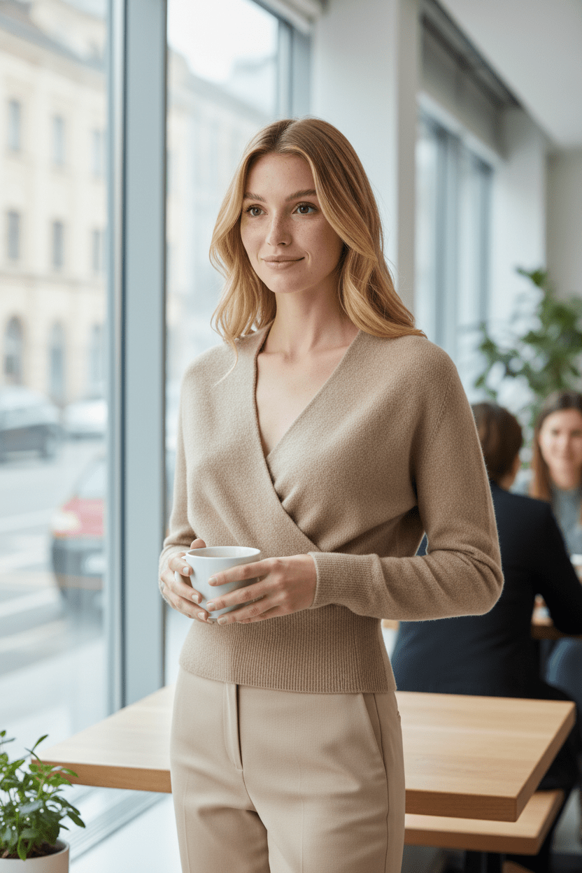 The Naya sweater combines cozy comfort with a touch of refined elegance. Crafted from a soft material blend, it features a classic wrap-style front, long sleeves, and a relaxed fit that flatters every figure. The ribbed waistline defines the silhouette while maintaining ease of movement, making it an ideal choice for both casual and semi-polished outfits. Perfect for transitional weather, this sweater brings warmth and effortless style to your everyday wardrobe.